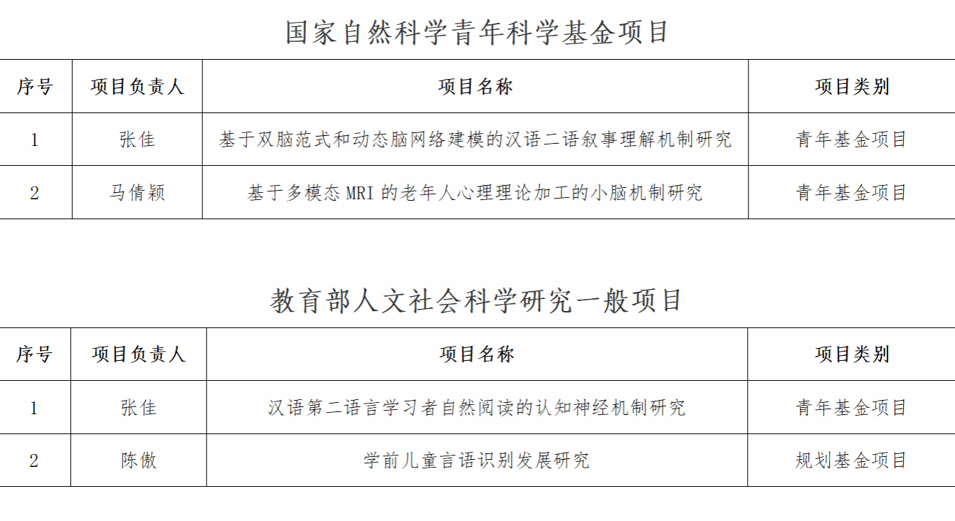 近日,国家自然科学基金委员会和教育部分别公布了2025年度国家自然科学青年科学基金项目和教育部人文社会科学研究一般项目评审结果。心理与认知科学学院喜获2项国家自然科学青年科学基金项目和2项教育部人文社会科学研究一般项目立项资助。