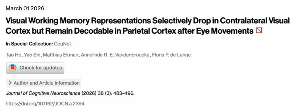 Tao He, Yao Shi, Matthias Ekman, Annelinde R. E. Vandenbroucke, Floris P. de Lange; Visual Working Memory Representations Selectively Drop in Contralateral Visual Cortex but Remain Decodable in Parietal Cortex after Eye Movements. J Cogn Neurosci 2026; 38 (3): 483–496.