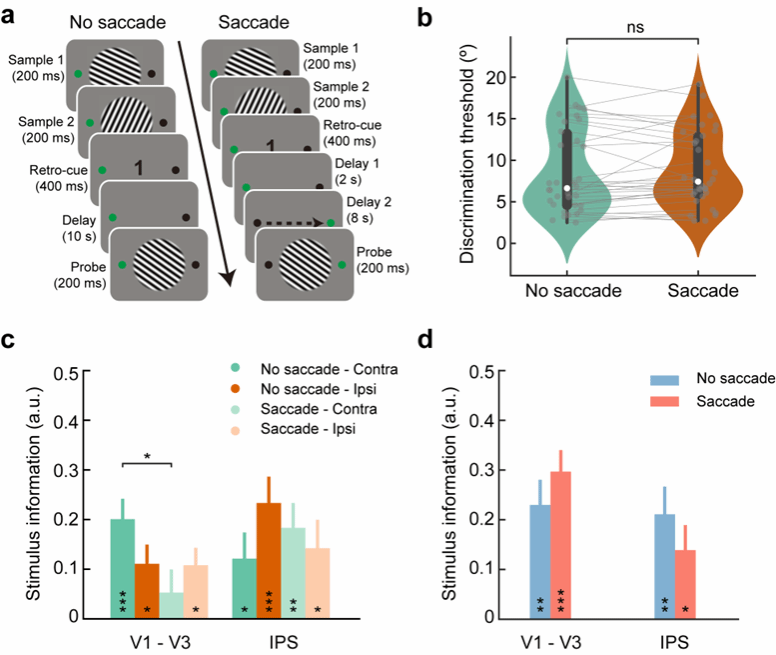 研究采用延迟朝向辨别任务:参与者需记住光栅的朝向信息,并在记忆保持阶段要么保持注视不动,要么按提示完成一次眼跳。研究团队基于多变量模式分析(MVPA)对保持期的脑活动进行解码,结果发现:无眼跳条件下,在初级视皮层(V1–V3)与顶内沟(intraparietal sulcus, IPS)均可成功解码出工作记忆信息,支持视觉工作记忆具有“空间全局”的表征特点。眼跳发生后,IPS双侧半球的记忆信息仍保持稳定可解码;而初级视皮层中刺激的对侧半球记忆表征出现显著下降,同侧半球不受影响。值得注意的是,若将双侧半球信息合并后解码,初级视皮层的整体记忆信息并未因眼跳而消失,提示视觉工作记忆可能通过更分布式、冗余的方式得以维持。