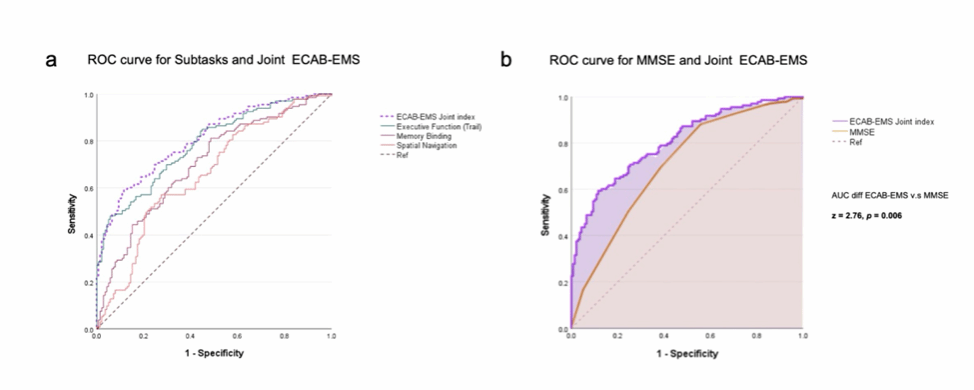 该工具创新性地融合三个核心认知模块:认知灵活性测验、非命名材料的联想记忆测验,与多参照的空间记忆能力测验,通过交互式电子任务评估老年人关键认知能力。研究团队对271名年龄56至89岁的老年人(138例MCI,133例认知正常对照)进行验证,结果显示,该工具具有优异的信效度,在区分MCI与正常认知状态方面达到72%的准确率,受试者工作特征曲线下面积(AUC)达0.807(95% CI: 0.756–0.858),显著优于传统纸笔版《简易精神状态检查》(MMSE)。