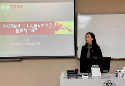 为深入贯彻学习党的十九届五中全会精神,11月26日上午,马克思主义学院教师党支部与心理学院直属党支部、培训学院出国部教师党支部联合举办系列党课。马克思主义学院党总支书记、院长丁文阁开展了一堂题为“学习领悟中共十九届五中全会精神中的‘新’”的党课。