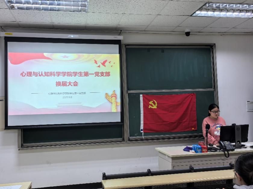 2025年11月6日18时,北京语言大学心理与认知科学学院学生第一党支部换届选举大会在教四106教室隆重举行。本次大会核心任务为听取和审查上届党支部委员会工作报告、选举产生新一届党支部委员会,由学生党支部副书记李新蕾同志主持。大会应到党员17名,其中有选举权的正式党员13名,实到正式党员12名、预备党员2名,因故未到会的正式党员均已提交书面表决意见,符合换届选举相关规定,会议顺利启幕。