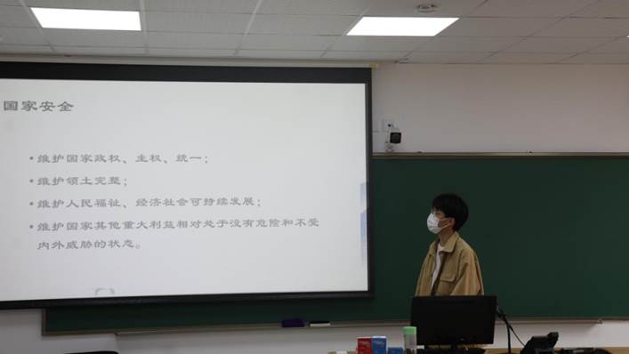 首先,团支书张子涵从国家安全教育的角度出发,向同学们阐释了国家安全的基本内涵和重要性。接着张子涵分享了党的十九大和二十大报告中有关国家安全的相关内容,从这些表述中同学们深刻体会到了党对国家安全的重视,以及随着社会的不断发展,党和国家也顺应国际形势不断提出维护国家安全和社会稳定的新思想、新观点、新任务。