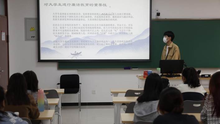 然后是本次班会的第二部分,团支书张子涵带领大家进行了主题为“树立廉洁观念,共建和谐校园”的学习分享。张子涵先结合时事讲解了国家政策中与廉洁有关的内容,再和同学们分享了几位廉洁诚信的模范人物的事迹,引导同学们从平凡事例中汲取力量,树立良好学风、共同营造风清气正的校风院风。