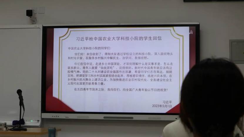 今天我们深入学习领会了习近平总书记给中国农业大学科技小院学生回信的精神,我认识到了我们也需要扎根基层,把学习的知识融入中国特色社会主义建设,为基层建设做出自己的贡献。