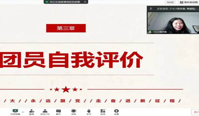首先,团支书曹雨彤带领团员们奏唱团歌,每位同学都打开了摄像头,团歌节奏铿锵、歌声激昂,同学们立刻肃然起敬。